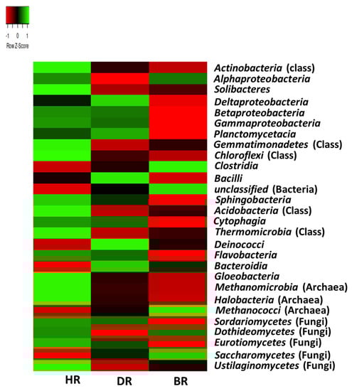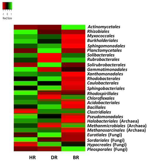 The predominant bacterial order in HR include Rhizobiales (12%), Burkholderiales (6.4%), Myxococcales (5.5%), Sphingomonadales (5.1%), Solibacterales (3.2%), Gemmatimonadales (2%), Xanthomonadales (1.6%), Caulobacterales (1.8%), Rhodospirillales (1.7%), Chloroflexales (1.1%), Acidobacteriales (1.0%), Clostridiales (0.9%), and Pseudomonadales (0.7%). The archaeal orders are Halobacteriales (0.2%) and Methanosarcinales (0.1%). The fungal orders are Eurotiales (0.07%) and Hypocreales (0.2%). The predominant bacterial order in the DR samples include Planctomycetales (4.8%), Solirubrobacterales (2.9%), Rhodobacterales (2.0%), Sphingobacteriales (1.3%), and Bacillales (1.1%). The fungal order is Sordariales (0.05%). The predominant bacterial order of microbial communities with the highest mean in BR samples are Actinomycetales (35.6%), and Rubrobacterales (3.6%) with the fungus Pleosporales (0.2%), while the most abundant archaeal order is the Methanmicrobiales (0.06%) (Figure 4)