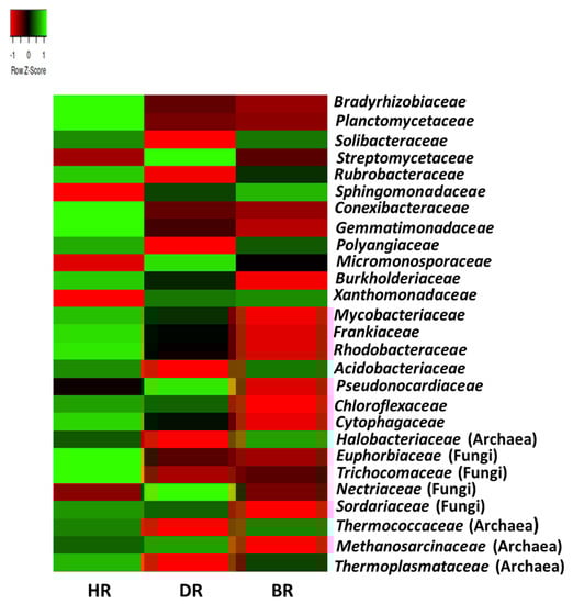The family heatmap of soil microorganisms affiliated with the tomato plants. Each plot with unique color functioned as a saturation gradient employing the mean value with a z-score. HR = rhizosphere soil of healthy tomato plant; DR = rhizosphere soil of diseased tomato plant; and BR = bulk soil obtained from the soil without tomato plantation.