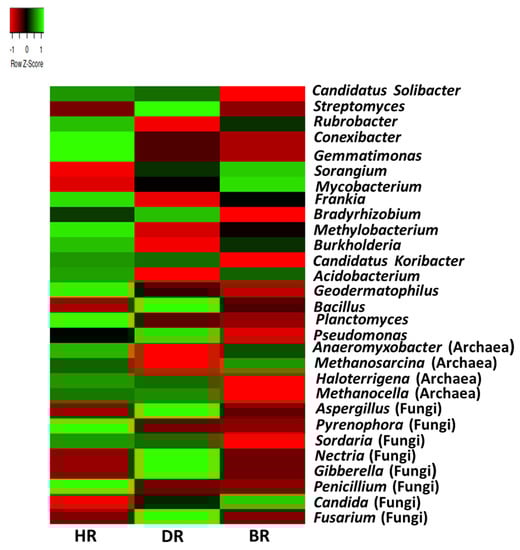 The genus heatmap of soil microorganisms affiliated with the tomato plants. Each plot with unique color functioned as a saturation gradient employing the mean value with a z-score. HR = rhizosphere soil of healthy tomato plant; DR = rhizosphere soil of diseased tomato plant; and BR = bulk soil obtained from the soil without tomato plantation.