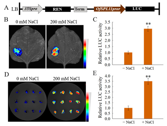 Salinity directly activates the activity of proOfSPL11. (A) Schematic representation of OfSPL11pro:LUC; (B,C) the activity of proOfSPL11 was activated in tobacco leaves; (D,E) the activity of proOfSPL11 was activated in callus of Osmanthus fragrans. Each experiment had three biological replicates. ** p < 0.01 were used to determine statistical significance.