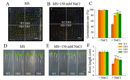 Seed germination and seedlings’ root length of OfSPL11−overexpressed Arabidopsis. (A,B) seed germination phenotypes of Arabidopsis in MS medium containing different concentrations of NaCl; (C) germination rate of Arabidopsis seeds; (D,E) root phenotypes of Arabidopsis seedlings in MS medium containing different concentrations of NaCl. Scale bars = 1 cm; (F) root length of Arabidopsis seedlings. Each experiment had three biological replicates. * p < 0.05 and ** p < 0.01 were used to determine statistical significance.