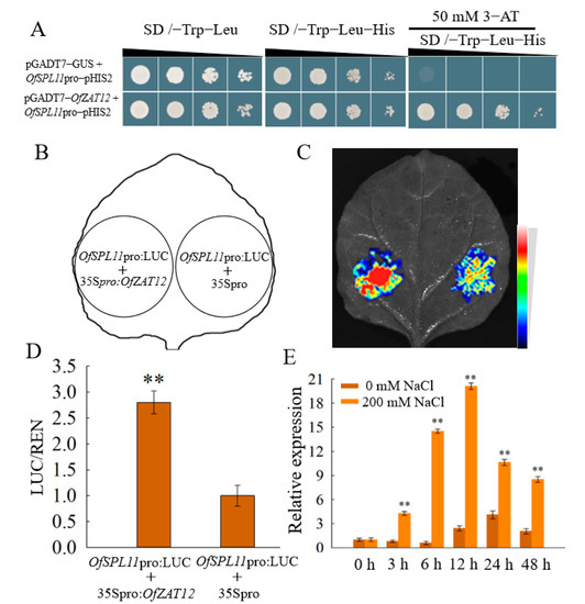 OfZAT12 regulated the expression of OfSPL11. (A) Yeast one-hybrid assay to verify the interaction between OfZAT12 and OfSPL11; (B–D) the Dual-Luciferase Assay Reagents were used to measure the activities of firefly LUC and REN; (E) OfSPL11 expression levels in Osmanthus fragrans young leaves after 200 mM NaCl treatment. The internal reference gene for O. fragrans is OfACT, and three biological re-reads were performed for each reaction. ** p < 0.01 were used to determine statistical significance.