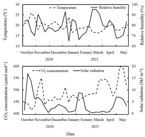 Variation in daily mean air temperature, relative humidity, CO2 concentration, and integral amount of solar radiation inside the greenhouse from October 2020 to May 2021.