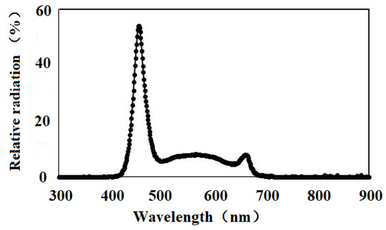 Relative spectral photon flux of polychromatic LEDs was used for the supplemental lighting treatment in this experiment. The wavelengths of the light sources were recorded at 240–800 nm with a spectrometer (SR9910-v7, Irradiant Ltd., Tranent, UK). A digital timer, dimmer, and transformer were used to maintain the light period and light intensity.