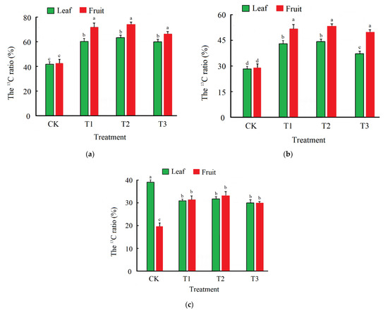 Distribution patterns of exported 13C in fruit fixed by different source leaves. (a) The 1st leaf as 13C source leaf, (b) the 2nd leaf as 13C source leaf, and (c) the 3rd leaf as 13C source leaf. 13CO2 was applied to leaves for 3 h and left to sit for 48 h; the effect of photosynthetic products on fruit development was determined by a stable isotope ratio mass spectrometer. Tukey’s HSD test was used, and vertical bars represent standard errors of the means (n = 15). Different letters indicate significant differences at p < 0.05, according to Tukey’s HSD test.