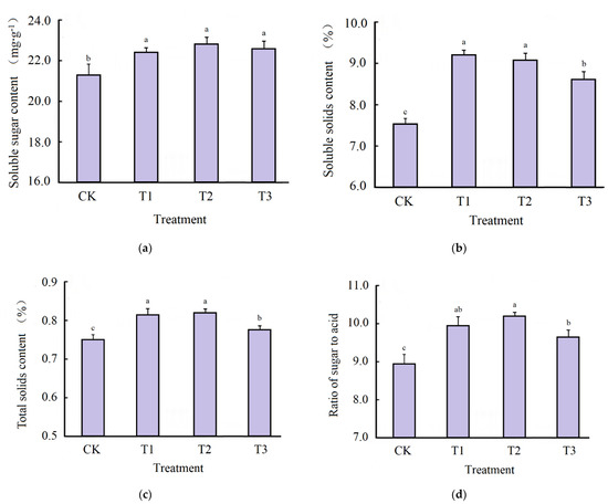 Fifteen fruits with the same maturity were randomly selected from each treatment, and the soluble solids content, acidity, and sugar–acid ratio of the tomato fruits were determined with a sugar–acid integrated machine (PAL-BXIACID3, ATAGO Co. Ltd., Tokyo, Japan); another 15 fruits with the same maturity were randomly selected for soluble sugar content determination using the anthrone colorimetric method [27].