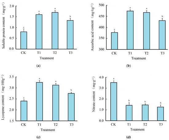 Fifteen fruits with the same maturity were randomly selected from each treatment, and the content of soluble protein in the tomato fruit was determined using the Coomassie brilliant blue method. In contrast, the ascorbic acid content was determined by the molybdenum blue colorimetric method [27]. The lycopene content was determined by the spectrophotometric method [28], and the nitrate–nitrogen content was determined by the salicylic acid colorimetric method [27].