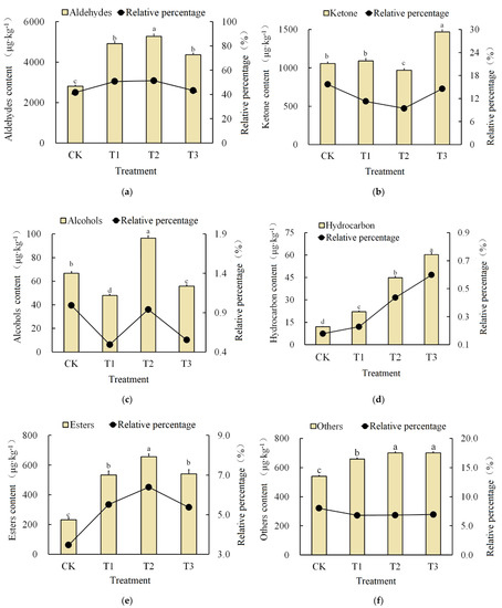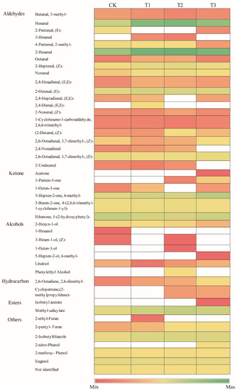 Forty-five kinds of volatile substances were detected, and the types and contents of volatile substances in each treatment were different (Figure 6 and Figure 7). Of them, the types of aromatic substances in the tomato fruit under the T3 treatment were the richest, with 35 species. The total content of the volatile substances in cherry tomato fruit under the T2 treatment was the largest, 10,266.26 μg·kg−1, which was 52.6% more than in the CK treatment. Nine main aromatic components were detected, including the hexanal, trans-2-heptenal, trans-2-hexenal, trans-2-heptenal, 1-pentene-3-ketone, 6-methyl Base-5-heptene-2-one, β-ionone, 2-phenylethanol, methylsalicylic acid. Of them, eigt were detected in the T2 treatment, and only seven were detected in the CK, T1, and T3 treatments. Hexenal is related to cherry tomato sweetness, and it had the highest value under the T2 treatment. It increased by 215.5%, 8.7%, and 32.9% compared with the CK, T1, and T3 treatments, respectively. The content of 6-methyl-5-heptene-2-ketone is related to the fruit flavor and was highest under the CK treatment. It decreased by 36.1%, 63.5%, and 64.8% compared to the T1, T2, and T3 treatments, respectively. The content of β-ionone, which is related to the sour taste of fruit, was highest in the T3 treatment. Aldehydes and ketones accounted for more than 80% of the total volatile substances, and the relative percentage of alcohols, esters, and hydrocarbons was less than 15%.