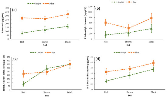 Interaction plots of the factors (soil and degree of ripeness) on the concentration of volatile compounds: (a) 1-hexanol, (b) hexyl-3-methyl butanoate, (c) 3,3-dimethyl-1-hexanol, (d) cis-3-hexenyl hexanoate. The error bars represent the standard uncertainty (p ≤ 0.05). The average values of the volatile compounds found in both varieties (Mayapan and Jaguar) were used. The concentration of volatile compounds is expressed on a fresh weight (FW) basis.