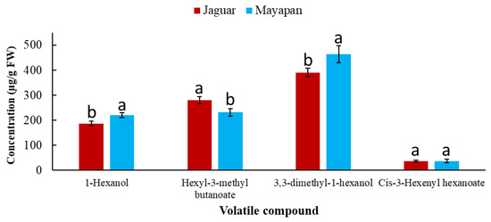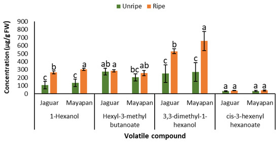 Bar plots of: 1-hexanol, hexyl-3-methyl butanoate, 3,3-dimethyl-1-hexanol, and cis-3-hexenyl hexanoate. Error bars represent the standard uncertainty (p ≤ 0.05). Different letters in the same volatile compound indicate statistically significant differences using minimum significant differences (MSD) test at p ≤ 0.05. Results presented in the figure are the average of both the three evaluated soils and the two degrees of ripeness of the Habanero pepper. The concentration of volatile compounds is expressed on a fresh weight (FW) basis.