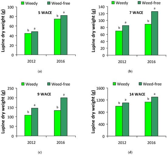 Dry weight of white lupine plants in weedy and weed-free plots (a) 5 weeks after crop emergence (WACE); (b) 7 WACE; (c) 9 WACE; (d) 14 WACE in the first and second growing season. Different letters in each growing season within each sub-figure indicate statistically significant differences at p < 0.05.