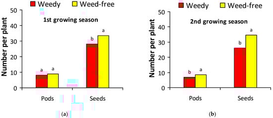 Number of white lupine pods and seeds per plant in weedy and weed-free treatments (a) in the first growing season; (b) in the second growing season. Different letters in each variable indicate statistically significant differences at p < 0.05.