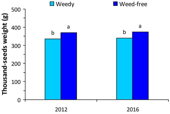 Due to significant main effects and interactions between growing season and treatment for some variables, yield components data are presented separately for each growing season (Figure 2). The presence of weeds reduced the number of pods per plant only in the second growing season and the number of seeds per plant in both years (Figure 2). The reduction in the number of seeds per plant was 15.6% in the first growing season (Figure 2a) and 24.6% in the second growing season (Figure 2b). The weight of 1000 seeds was also reduced in the weedy plots in both growing seasons (Figure 3) and was on average 338 vs. 371 g for the weedy and the weed-free treatment, respectively. Protein concentration in the seeds was on average 33.4% in plants without weed competition and 32.8% in plants under weed competition.
