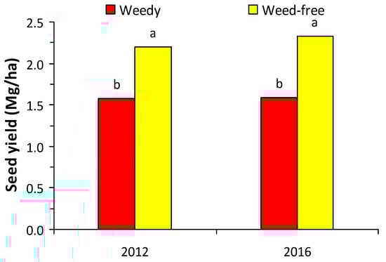 The high levels of seed yield in both years revealed the high adaptability of the crop to the growing area, which were also supported by the high fertility of the experimental soil. However, seed yield in both years was significantly reduced by the presence of weeds (Figure 4), resulting in the potential yield not being achieved due to weed competition.