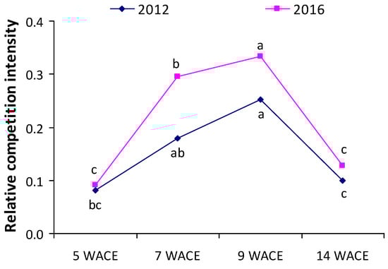 Relative competition intensity (RCI) index at various weeks after crop emergence (WACE) in the first and second growing seasons. Different letters in each growing season indicate statistically significant differences at p < 0.05.