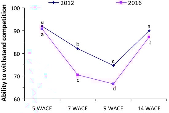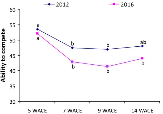 Ability to withstand competition (AWC) index at various weeks after crop emergence (WACE) in the first and second growing seasons. Different letters in each growing season indicate statistically significant differences at p < 0.05.