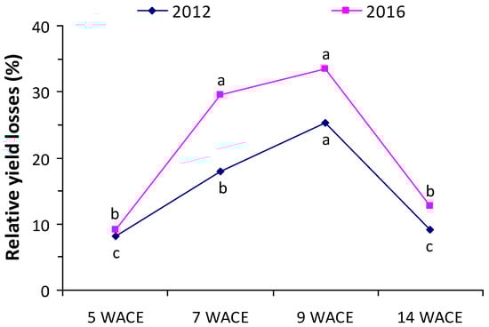 Relative yield loss (RYL) index at various weeks after crop emergence (WACE) in the first and second growing seasons. Different letters in each growing season indicate statistically significant differences at p < 0.05.