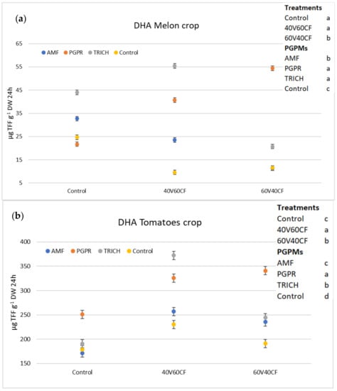 DHA showed similar trends between the two crops, although the level was higher in tomato plants, potentially because the rhizosphere microbiota had more time (due to the longer cycle) to increase its population dynamics, making the transformation from organic to inorganic sources available for plants. This suggests that the reduction in DHA in the melon crop may have been because the microbiota of the substrate had a prolonged adaptation phase (lag) and did not reach its maximum growth, resulting in reduced activity. However, the tomato crop (cycle of six months of cultivation) achieved maximum development and showed higher DHA. Furthermore, lower levels of DHA were seen in control without PGPMs in both crops, tomato, and melon. The enzymatic activity, DHA, allows an assessment of the microbial activity.