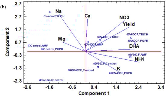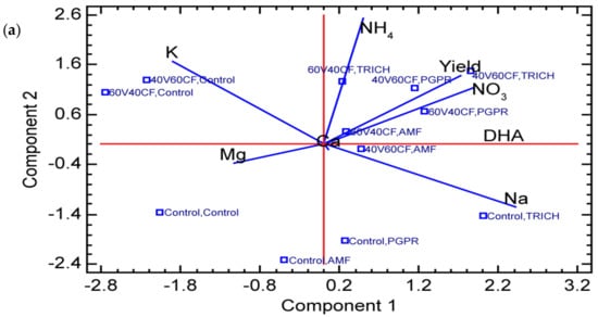 Figure 2a presents the results of the melon crop PCA carried out on cations, anions, yields, DHA, substrates, and PGPMs, showing that three main components were selected, with the first and second components accounting for 55.76% of the total variance. The variables in component 1 showed a direct correlation and synergy between yield and DHA, with NO3− linked to TRICH and PGPR in substrates with a higher amount of vermicompost (40V60CF, 60V40CF), also indicating that yield is correlated with higher PGPM activity. This can be interpreted by the potential of microorganisms associated with organic matter to increase enzyme activity (DHA) and consequently improve the availability of NO3− and NH4+ in response to the increased availability of N due to the activity of microorganisms and increased crop yields. On the other hand, the application of AMF did not influence PC1. It can also be seen that the variables that most influenced the variability (greatest distance from the midway point) were K+, NH4+, Na+, and NO3−, in contrast to Mg2+ and Ca2+.