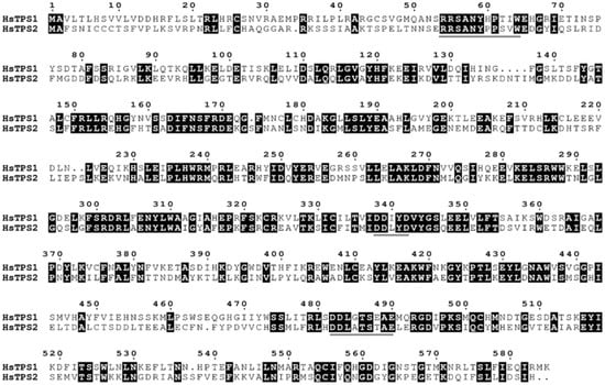 Protein sequence alignment of the two HsTPS was constructed using ClustalW and was edited using Escript 3.0. The three conserved motifs, RRx8W, DDxxD, and DDxxTxxxE, characteristic of terpene synthases, were overlined in gray.
