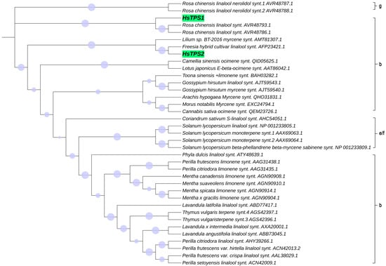 The RNA of Hosta flower was reverse-transcribed into cDNA and analyzed by PCR. HsTPS1 (1758 bp) and HsTPS2 (1770 bp) encode 586 and 590 amino acids, respectively, with molecular weights of 67.48 and 68.1 kDa. The HsTPS1 full-length sequence shared 56.79% amino acid identity with the (R)-linalool synthase from Magnolia champaca (ART66980.1). In addition, HsTPS1 had 56.69% and 56.50% homology with trans-ocimene synthase from Litsea cubeba (AEJ91554.1) and Cinamomum micranthum f. kanehirae (RWR 88332.1). The homology of HsTPS1 with monoterpene synthase from a Lilium hybrid cultivar (QBP79170.1) was 52.90%. The HsTPS2 full-length sequence shared 63.06% and 61.75% identity with the linalool synthase from a Freesia hybrid cultivar (AQM50913.1) and 54.02% identity with the myrcene synthase from Lilium sp. BT-2016 (AMT81307.1). HsTPS1 and HsTPS2 shared 44.46% identity with each other (Figure 1). Terpenoid synthases are usually categorized into seven branches, named TPS-a, TPS-b, TPS-c, TPS-d, TPS-e/f, and TPS-g [6]. The following motifs have already been reported to be implicated in catalysis by TPS: an anarginine-enriched region, often appearing as an RRx8W motif; a specific linalool synthase region, often appearing as (M/L)L(S/Q/N) L(F/Y)EAS; asparticacid-enriched and glutamic acid-enriched regions, appearing as DDXXD and NSE/DTE motifs [37,38]. The RRx8W motif is characteristic of the N-terminal domain of monoterpene synthases, as well as the TPS-b subfamily in angiosperms and the TPS-d subfamily in gymnosperms [39,40,41]. It has also been demonstrated to be isomerized in the first step from geranyl diphosphate to linalalyl diphosphate [42,43]. These motifs may be involved in the linalool synthase activity of HsTPS1 and 2. The LSLYEA(S/A) motif of HsTPS was located in a highly similar region to that seen in other mTPSs, considered to be an active site peptide. The highly conserved DDXXD motif is generally recognized as a binding site for the metal ion-chelated diphosphate ester substrate [44]. In contrast, NSE/DTE motifs are less conserved, and they are known to be combined with divalent metal ion cofactors in enzyme activity [37,45]; they were present as the DDL(G/A)TS(E/T)AE motif in the HsTPS amino-acid sequences. In general, monoterpenes tend to cluster by genus rather than function [37]. Thirty-five different mTPSs from twenty-seven different species and two HsTPSs were aligned in this study, and a phylogenetic tree was constructed (Figure 2). It is worth mentioning that most of the reported linalool/nerolidol synthases belong to the TPS-g group. This is a subfamily closely related to the TPS-b group, which comprises angiosperm acyclic terpene synthases. Both TPSs were clustered into the TPS-b group, close to the TPS-g group.