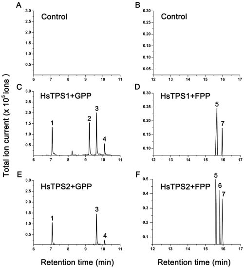 The recombinant proteins were obtained from the E. coli Rosetta (DE3) strain using a pET-28a expression vector. The soluble portion of the protein induced by low temperature was purified and incubated with GPP and FPP substrates, and the products were analyzed by GC–MS (Figure 3). The two recombinant proteins were active when incubated with GPP substrates and produced monoterpenes. Incubation of recombinant HsTPS1 with GPP mainly produced linalool, citronellene, and nerol. In addition, minor amounts of geranial were detected. Incubation of recombinant HsTPS2 with GPP produced linalool, nerol, and geranial. After incubation with FPP, both recombinant proteins showed activity and produced sesquiterpenes in lower amounts. Recombinant HsTPS1 used FPP to produce (E,E)-farnesol and (E,E)-farnesal. In addition to the above two sesquiterpenes, recombinant HsTPS2 protein also produced a small amount of nerolidol.
