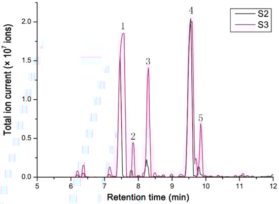 The total ion chromatogram of scent components emitted from the flowers of two different developmental floral stages. The stage of flower buds one day before full bloom (S2) and full-bloom flowers for one day (S3). 1 = β-Pinene; 2 = α-Phellandrene; 3 = D-Limonene; 4 = Linalool; 5 = β-Phellandrene.