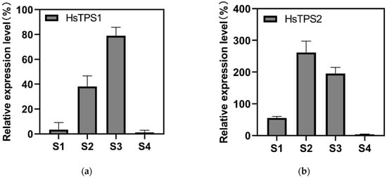 Relative expression analysis was performed by qRT-PCR using Actin as reference genes. (a) Relative expression levels of HsTPS1; (b) Relative expression levels of HsTPS2. The relative transcription level in tissue with the highest expression quantity was set to 1 (100%). Each bar represents the mean value ±SE of three biological and three technical replicates (p-value < 0.05). The stage of flower buds two or three days before full bloom (S1); flower buds one day before full bloom (S2); full-bloom flowers for one day (S3); and flowers one day after full bloom (S4).