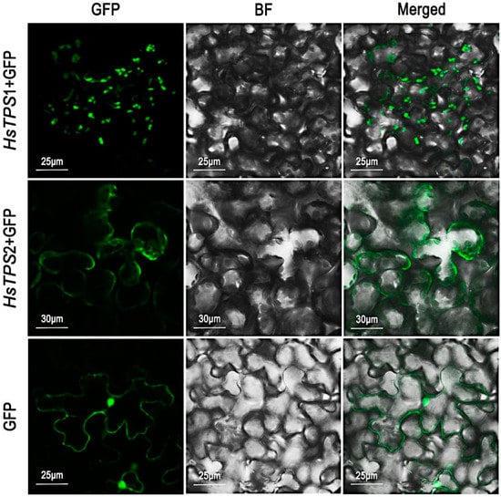 Subcellular localization of HsTPS1 and HsTPS2 by transient transformation of N. benthamiana with Agrobacterium carrying a pCambia 1300 expression vector, where the HsTPS1 and HsTPS2 coding sequence was fused with the GFP coding sequence, respectively. GFP, GFP fluorescence detected in the green channel; BF, brightfield image; Merged, merged green and BF channel images.