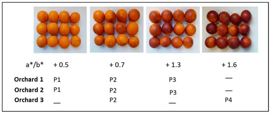 In this study, the rind pigmentation of fruit depended on the orchard. The fruit from Orchards 1 and 2 showed similar pigmentation ranges and were divided into three lots according to pigmentation intensity (P1—slight, P2—medium, and P3—intense). However, the fruit from Orchard 3 were generally more coloured and homogenous, and only two lots were obtained (P2—medium and P4—very intense pigmentation). A representation of the different pigmentation intensities is shown in Figure 1.