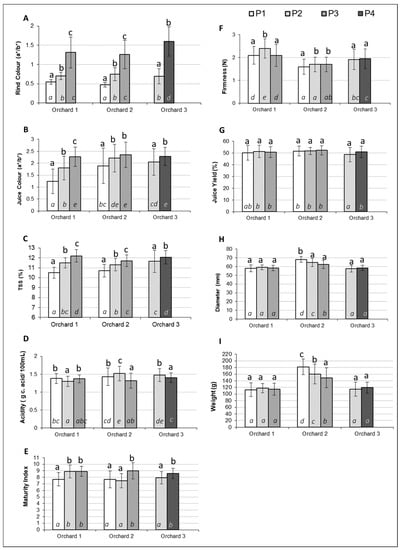 Effect of rind pigmentation intensity (P1—slight, P2—medium, P3—intense, P4—very intense) of ‘Sanguinelli’ on internal properties ((A)—rind colour, (B)—juice colour, (C)—TSS, (D)—titratable acidity, (E)—maturity index, (F)—firmness, (G)—juice yield, (H)—diameter, (I)—weight). For each orchard, different letters above the bars indicate significant differences among fruit lots. The italics at the bottom of the bars denote differences among fruit lots when comparing all the fruit lots; i.e., when comparing the lots from the three orchards by Duncan’s multiple range test (p = 0.05).