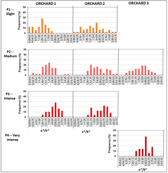 Frequency distribution of the pulp colour (a*/b* values of juice) of ‘Sanguinelli’ blood oranges grouped according to rind pigmentation (P1—slight, P2—medium, P3—intense, P4—very intense). Each group of intensity per orchard consisted of 50 individually analysed fruits.