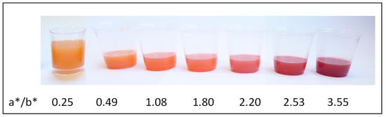 To more profoundly study the relation between the rind and pulp colour, the frequency distribution histogram was obtained (Figure 3). To help interpretate these data, a juice colour scale was developed in this study (Figure 4). Bars in the histogram (Figure 3) represent the percentages of juice samples (y-axis) within a certain range of a*/b* values (X-axis). A similar distribution was detected in the three orchards under study. The fruit with slight rind pigmentation (P1) displayed wide pulp pigmentation variability, with a*/b* values ranging between 0.25 and 2.25 (Orchard 1) and between 0.25 and 3.75 (Orchard 2). As observed in Figure 4, these values correspond to the fruit with orange pulp and red-coloured pulp, respectively. In the fruit with rind colour P2, variability was narrower than in P1, as pulp colour was generally more pigmented, and most of the samples had a*/b* values that fell within the range of 1.25–2.50 (Figure 3). In the P3 group, no juice with a*/b* values lower than 1.25 was detected, and most samples concentrated a*/b* values between 2 and 2.75, which corresponded to deep red juice. Finally, the most rind-pigmented fruit (P4) obtained pulp a*/b* values between 1.50 and 3, which were once again related to deep pigmented pulp (Figure 4). Therefore, it can be stated that, although certain intra- and inter- orchard variabilities can be expected, the more pigmented the skin colour is, the higher the probability of finding fruit with a deep red pulp.