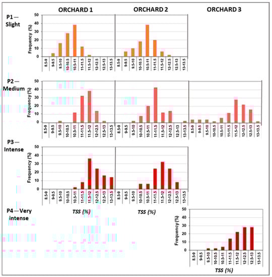 Once again, we looked closely at the relation between TSS and rind colour by obtaining the frequency distribution histogram, in which bars represent the percentage of juice samples with a certain range of TSS content (Figure 5). TSS ranged between 8.5 (P2-Orchard 3) and 13.5 (P3-Orchard 1). Similar to that described for pulp colouration, TSS showed certain intra- and inter-orchard variability but, in all cases, the more pigmented the rind, the higher the frequency of the samples with high TSS. This was clearly observed in Orchard 2, where the most frequent TSS content was 10.5–11% for P1-fruit, 11–11.5% for P2-fruit, and 11.5–12% in P3-fruit.