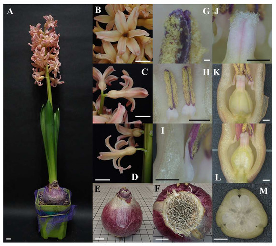 Overview and close-up photos of Hyacinthus orientalis L. ‘Gipsy Queen’. (A) Overview of an individual of Hyacinthus orientalis L. ‘Gipsy Queen’ (scale bar = 1 cm). (B–D) The corolla (scale bar = 1 cm). (B) Front view. (C) Side view of corolla on the upper inflorescence. (D) Side view of corolla on the lower inflorescence. (E,F) The bulb (scale bar = 1 cm). (E) Side view of the bulb of which tunic is in slivery purple. (F) The disc with remnant roots. (G–I) Androecium. (G) Pollen sacs under microscopy (scale bar = 0.01 cm). (H) Stamens (scale bar = 0.1 cm). (I) Filaments of dorsifixed anthers (scale bar = 0.1 cm). (J–M) Gynoecium (scale bar = 0.1 cm). (J) Receptive papilla on the stigma. (K) Superior ovary. (L) Longitudinal section of the ovary showing axile placentation. (M) Cross section of the ovary showing ovules in three locules.