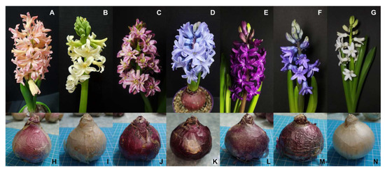 Inflorescences and tunicate bulbs of the seven Hyacinthus cultivars. (A–G) Inflorescences. (H–N) Tunicate bulbs. (A,H) ‘Gipsy Queen’. (B,I) ‘City of Haarlem’. (C,J) ‘Eros’. (D,K) ‘Chicago’. (E,L) ‘Woodstocks’. (F,M) ‘Delft Blue’. (G,N) ‘Aiolos’.