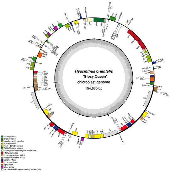 Chloroplast genome map of Hyacinthus orientalis L. ‘Gipsy Queen’. Intron-containing genes were asterisked (*).