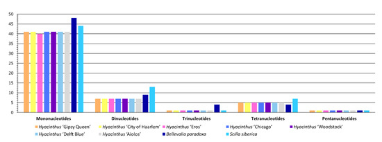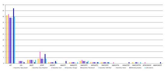 Regarding the sequence complementarity of SSRs, eight were detected in all the chloroplast genomes of the studied Hyacinthus cultivars, including A/T, AG/CT, AT/AT, AAT/ATT, AAAG/CTTT, AAAT/ATTT, AATG/ATTC and AGAT/ATCT (Figure 5). It is noteworthy that only the chloroplast genome of the ‘Eros’ had the SSRs AAGC/CTTG and ACTAT/AGTAT. These two SSRs could be potential markers for authenticating this cultivar, in the absence of inflorescence. Meanwhile, the chloroplast genome of ‘Eros’ did not contain the complementary AAATC/ATTTG that the chloroplast genomes of other Hyacinthus cultivars did. The chloroplast genome of ‘Eros’ had ten complementary AT/AT, which was significantly higher when compared with the chloroplast genomes of other Hyacinthus cultivars; each had only four such SSRs. Additionally, the chloroplast genomes of the orange-flower cultivar ‘Gipsy Queen’ and the yellow-flower cultivar ‘City of Haarlem’ did not have the complementary C/G in contrast to the chloroplast genomes of other Hyacinthus cultivars where each had two such SSRs.