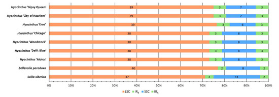 - Hu, F.R.; Ren, C.; Bao, R.L.; Liu, G.X. Chromosomes analysis of five diploid garden Hyacinth species. Sci. Hortic. 2011, 13, 82–87. [Google Scholar] [CrossRef]