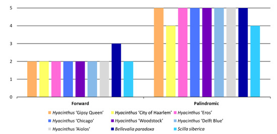 Only two types of LTRs, forward repeats and palindromic repeats, were detected in the nine newly assembled chloroplast genomes (Figure 7). The number of forward repeats was the same across the chloroplast genomes of Hyacinthus, i.e., two. The chloroplast genome of Bellevalia paradoxa had one more forward repeat than the other newly assembled chloroplast genomes. The chloroplast genome of ‘City of Haarlem’ and Scilla siberica had one less palindromic repeat than the other studied chloroplast genomes.