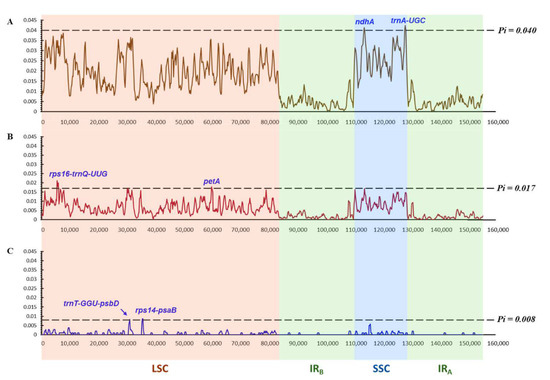 Nucleotide diversity values (Pi) of different combinations of Scilloideae chloroplast genomes. (A) Fifteen chloroplast genomes of Scilloideae including chloroplast genomes of Scilla siberica, Bellevalia paradoxa, Hyacinthoides non-scripta, Albuca kirkii, Oziroe biflora, seven Hyacinthus cultivars and three Barnardia japonica. (B) The nine newly de novo assembled chloroplast genomes in this study, including the chloroplast genomes of Scilla siberica, Bellevalia paradoxa and seven Hyacinthus cultivars. (C) Only the chloroplast genomes of seven Hyacinthus cultivars. The partitions of chloroplast genome were abbreviated as the following: Large Single Copy—LSC; IRB—Inverted Repeat B; Small Single Copy—SSC; IRA—Inverted Repeat A.