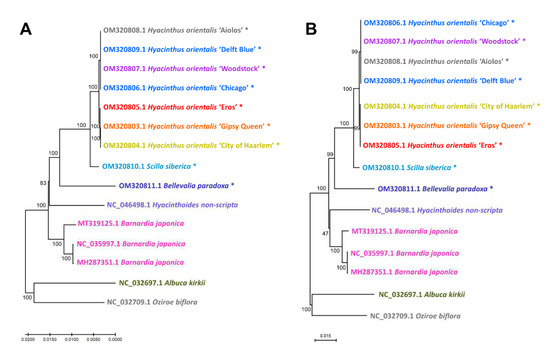 MAFFT version 7 (https://mafft.cbrc.jp/alignment/server/ (accessed on 31 January 2022)) [67] was applied to align chloroplast genomes. Cases of alignment included (i) seven Hyacinthus cultivars, (ii) seven Hyacinthus cultivars + Scilla siberica + Bellevalia paradoxa and (iii) seven Hyacinthus cultivars + Scilla siberica + Bellevalia paradoxa + Hyacinthoides non-scripta + three Barnardia japonica + Albuca kirkii + Oziroe biflora.