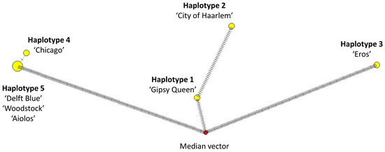 To increase the resolution of the differences among the seven chloroplast genomes of Hyacinthus cultivars, haplotype grouping was performed. The haplotype data file was generated using DnaSP [68] considering the alignment gaps. The haplotype data file was used to compute a median joining network [70] using Network version 10.2.0.0 [71]. Variation sites, including Single-Nucleotide Polymorphisms (SNPs) and Insertions–deletions (Indels), were then manually identified in the alignment using BioEdit [72]. The Molecular Diagnostic Characters (MDCs) were then manually identified from SNPs and Indels.