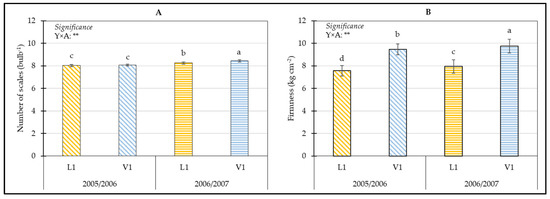 Influence of the interaction Y × A on the number of scales (A) and bulb firmness (B). Means with the same letter are not significantly different at p ≤ 0.05 according to Tukey’s test. Bars represent the standard error. ** = significant at p ≤ 0.01; Y = Year; A = Accession; L1 = Landrace (Bianca Calda di Comiso); V1 = Commercial Variety (Bianca di Maggio).