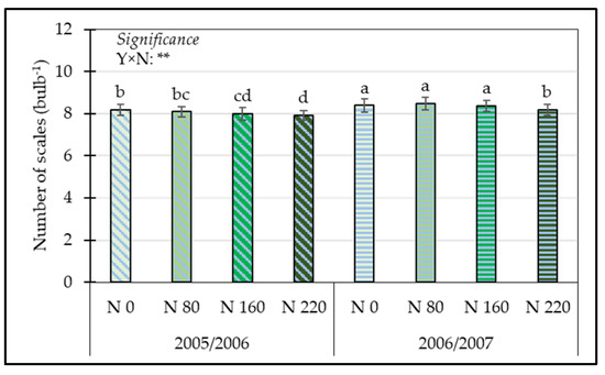 For the number of scales, ANOVA showed a significant effect of the interaction between year and nitrogen dose (Table S1). The highest number of scales for bulbs was collected from plots fertilized with 0, 80, and 160 kg N ha−1 during the second year of cultivation, whereas the lowest number of scales was observed in bulbs from the first year of cultivation and fertilized with the highest nitrogen dose (Figure 2).
