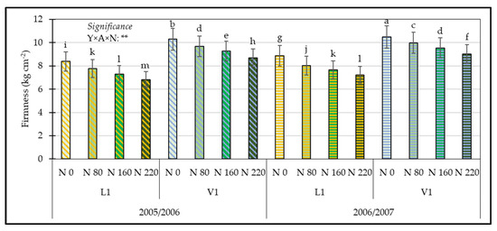Influence of the interaction Y × A × N on bulb firmness. Means with the same letter are not significantly different at p ≤ 0.05 according to Tukey’s test. Bars represent the standard error. ** = significant at p ≤ 0.01; Y = Year; A = Accession; N = nitrogen; L1 = Landrace (Bianca Calda di Comiso); V1 = Commercial Variety (Bianca di Maggio); N 0 = No-Nitrogen Fertilization; N 80 = fertilization with 80 kg N ha−1; N 160 = fertilization with 160 kg N ha−1; N 220 = fertilization with 220 kg N ha−1.