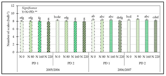 As regards the number of scales, statistical analysis displayed a significant effect of the interaction Y × N × PD (Table S1). The highest number of scales per bulb was exhibited in onions grown during the second cultivation year, in the traditional planting period, and with a mild nitrogen supply (80 kg ha−1); the lowest number of scales was recorded in bulbs from plots fertilized with 220 kg N ha−1 planted during the early period and cultivated in the first year, or in bulbs from plots fertilized with 160 or 220 kg N ha−1 planted during the traditional period and cultivated during the first year (Figure 4).
