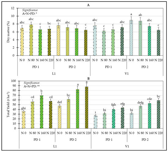 Influence of the interaction A × N × PD on dry matter (A) and total yield (B). Means with the same letter are not significantly different at p ≤ 0.05 according to Tukey’s test. Bars represent the standard error. ** = significant at p ≤ 0.01; * = significant at p ≤ 0.05; A = Accession; N = nitrogen; PD = Planting Date; L1 = Landrace (Bianca Calda di Comiso); V1 = Commercial Variety (Bianca di Maggio); N 0 = No-Nitrogen Fertilization; N 80 = fertilization with 80 kg N ha−1; N 160 = fertilization with 160 kg N ha−1; N 220 = fertilization with 220 kg N ha−1; PD 1 = Early Planting Date; PD 2 = Traditional Planting Date.