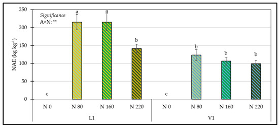 For the interaction A × N, the highest NAE was observed in the L1 accession fertilized with 80 or 160 kg N ha−1; the lowest values were observed in the combinations L1 × N 220, V1 × N 80, V1 × N 160, and V1 × N 220 (Figure 6).