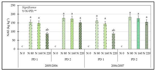 For the interaction Y × N × PD, excluding onions cultivated without N fertilization, the lowest values for the NAE were observed, in both years, in onions planted early and fertilized with 220 kg N ha−1 (Figure 7).